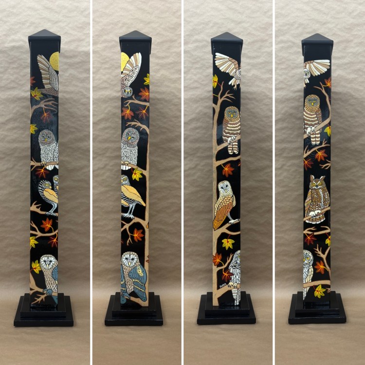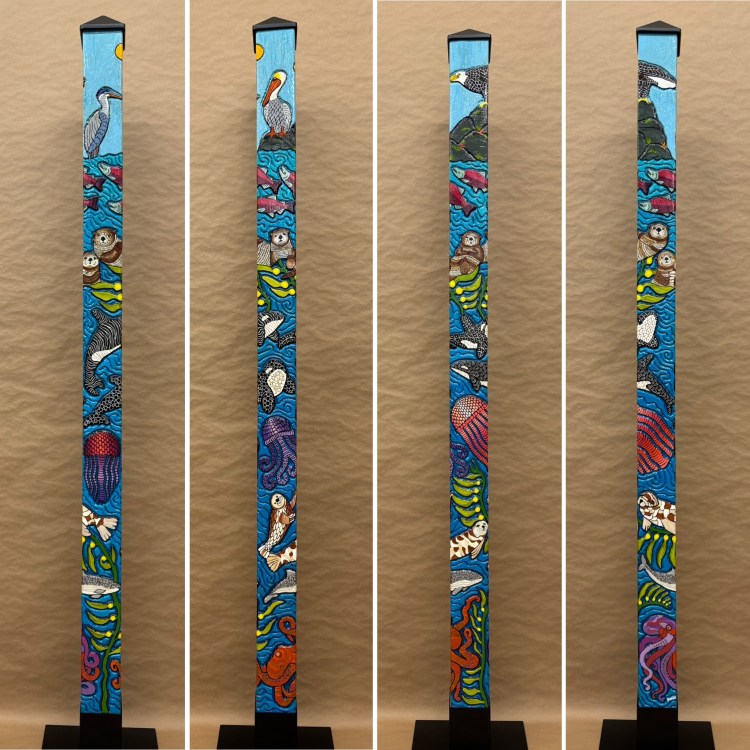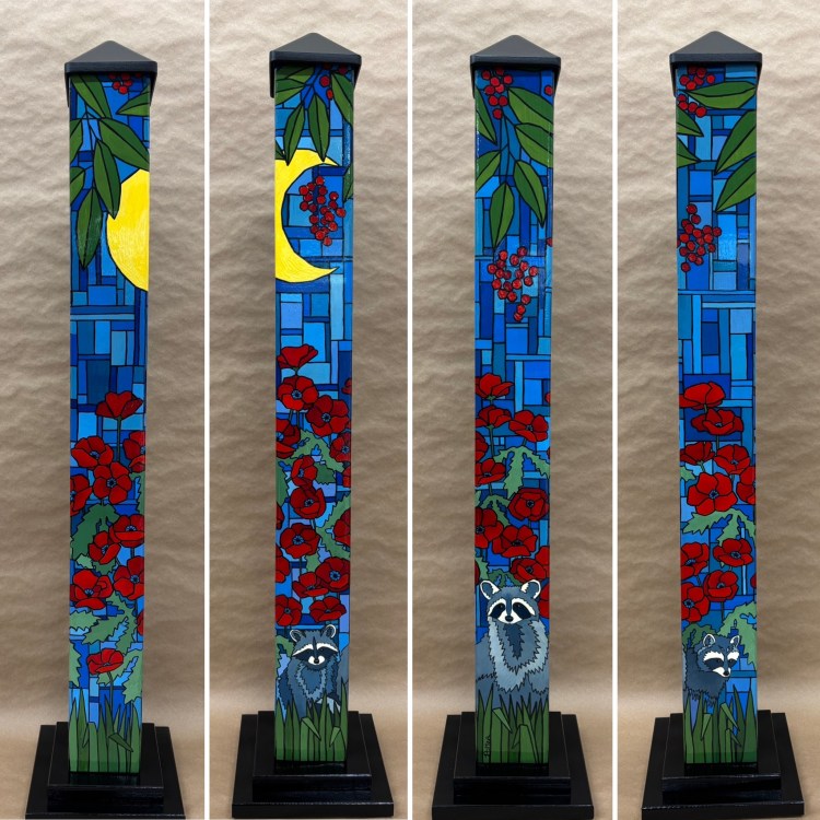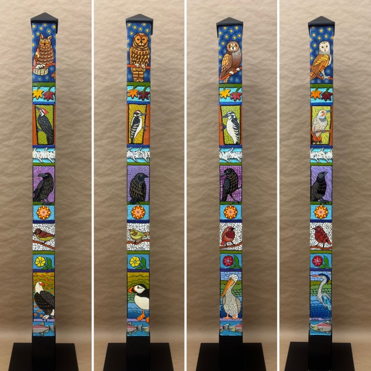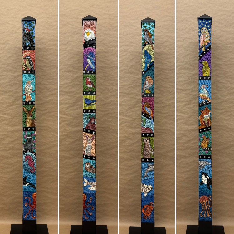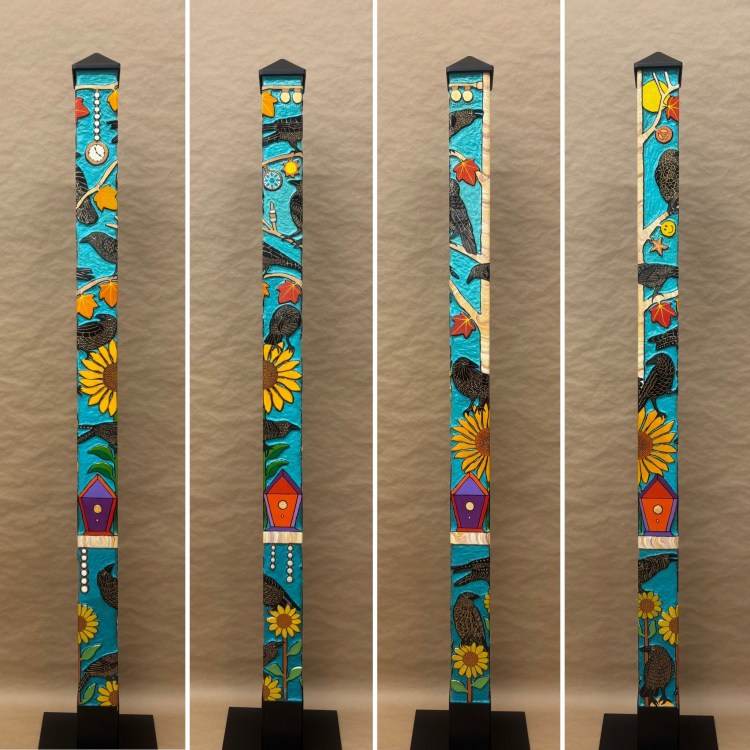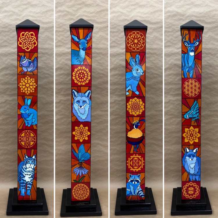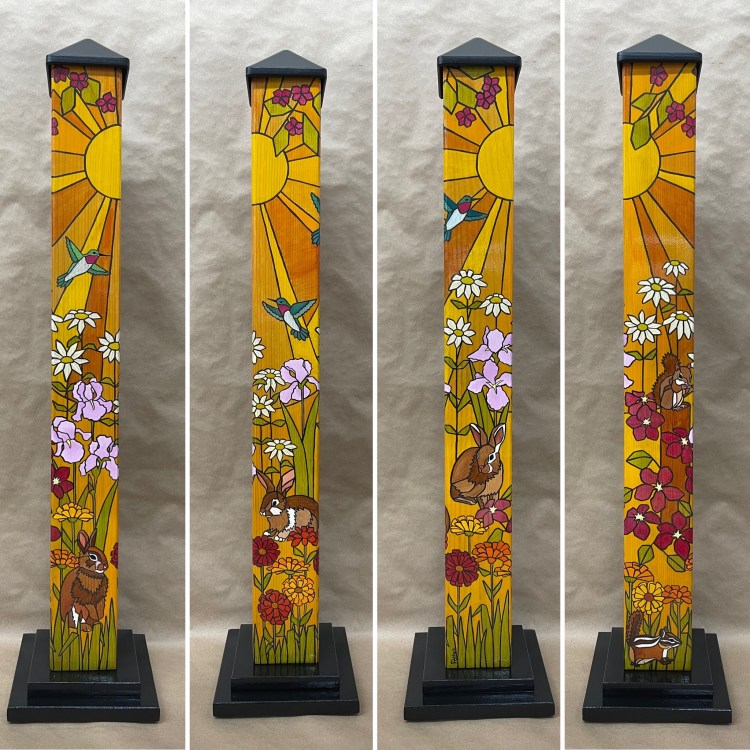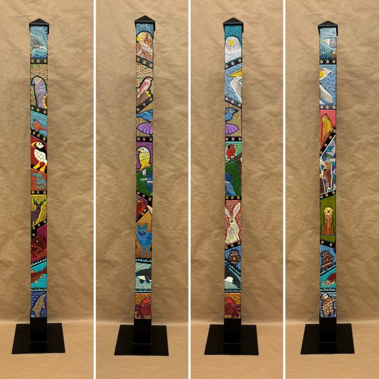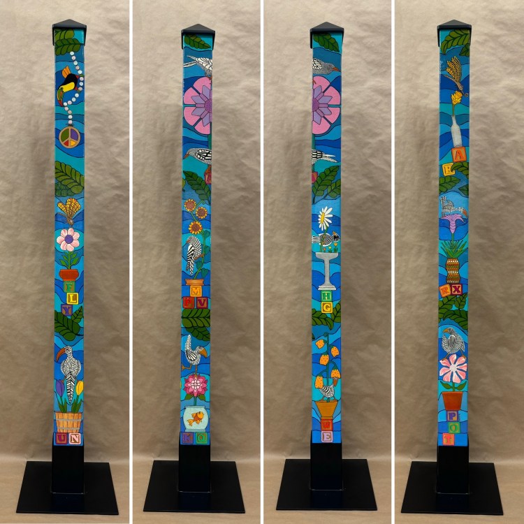 Section two of the gallery – POLES – displays our taller story poles (three feet or more…up to six feet). These poles all require a base to hold them safely and securely. Visit the “Information” page on this website to learn about the different base options for mounting your story pole indoors or outdoors. We are happy to talk with you about the best choice for your needs, so don’t hesitate to give us a call or send us a note to discuss the best base for you.