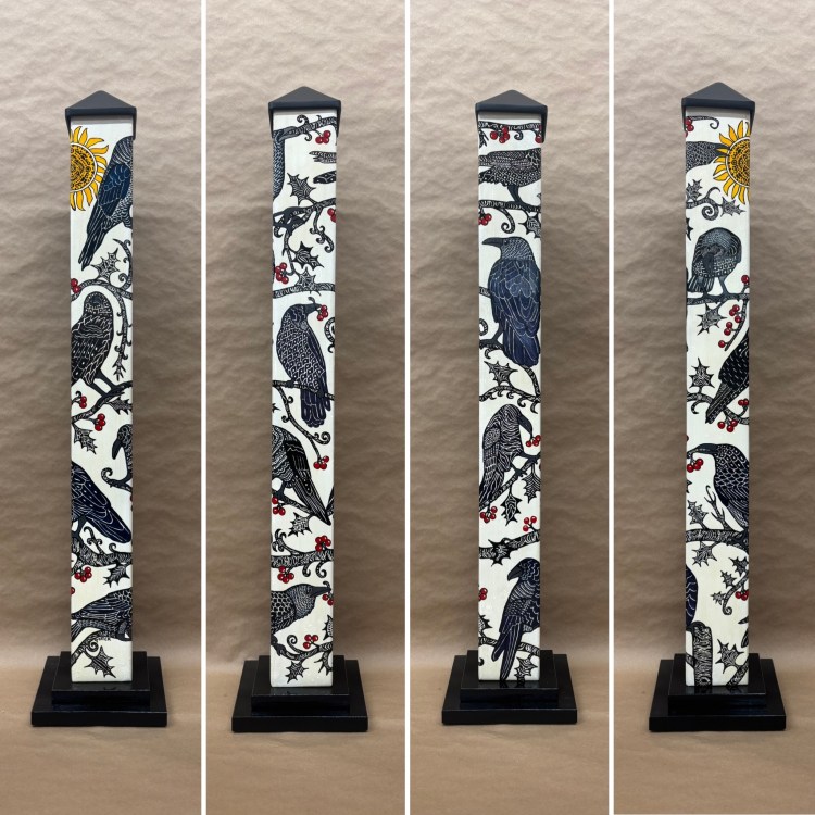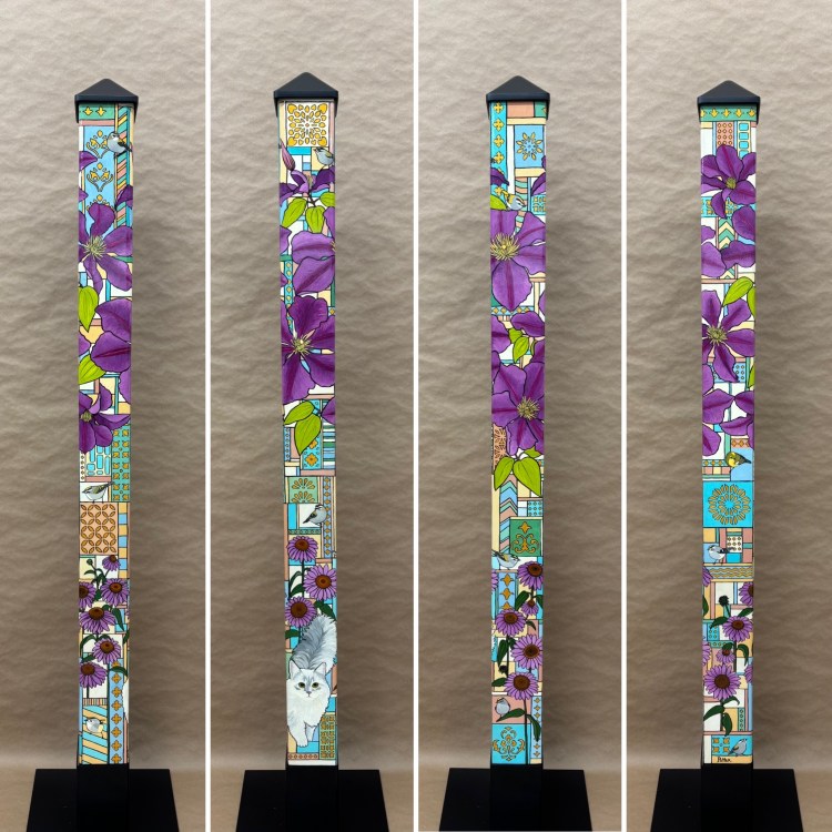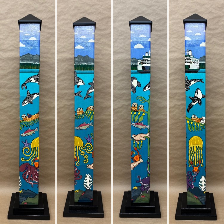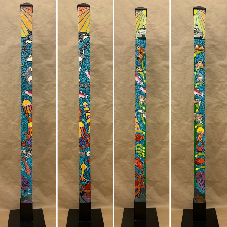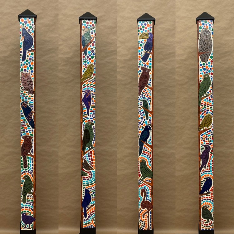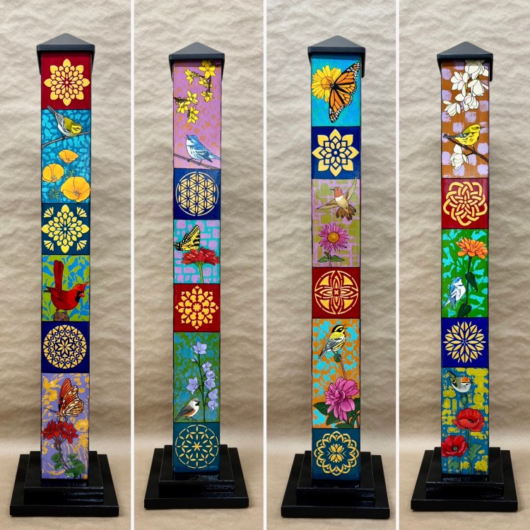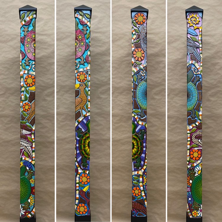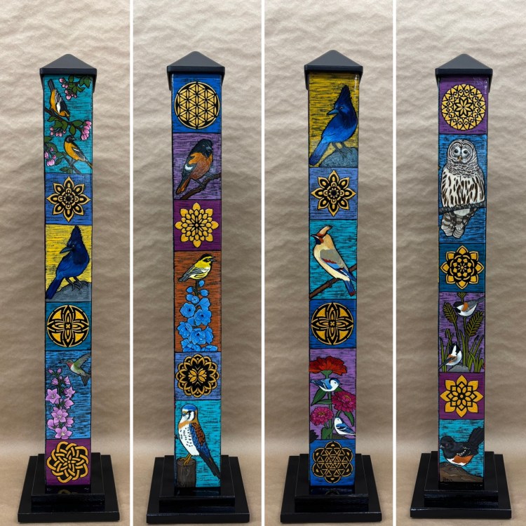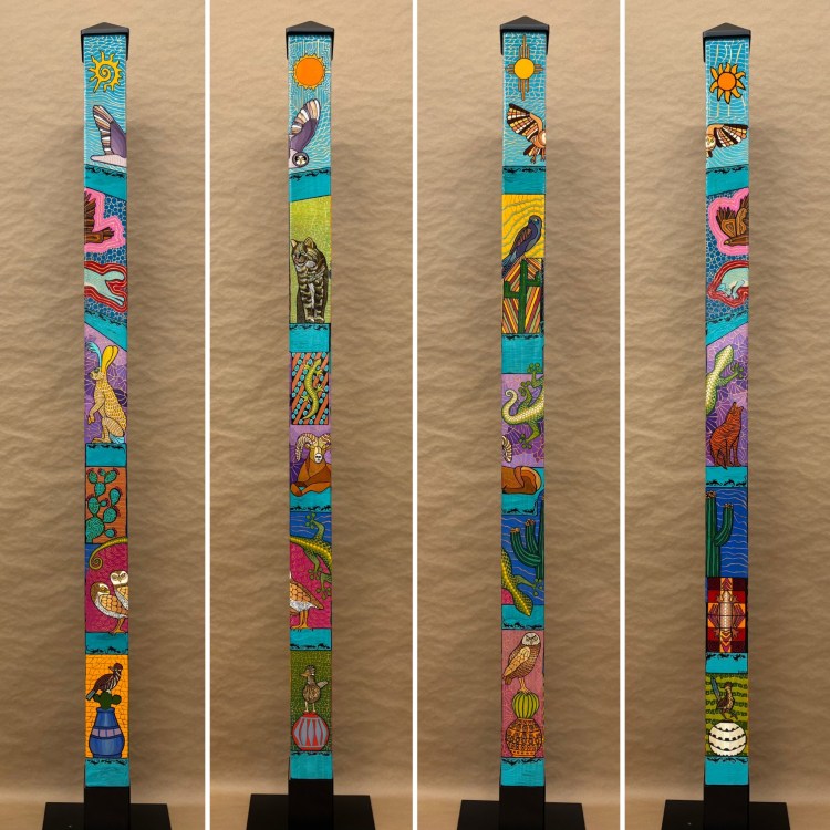 Section two of the gallery – POLES – displays our taller story poles (three feet or more…up to six feet). These poles all require a base to hold them safely and securely. Visit the “Information” page on this website to learn about the different base options for mounting your story pole indoors or outdoors. We are happy to talk with you about the best choice for your needs, so don’t hesitate to give us a call or send us a note to discuss the best base for you.
