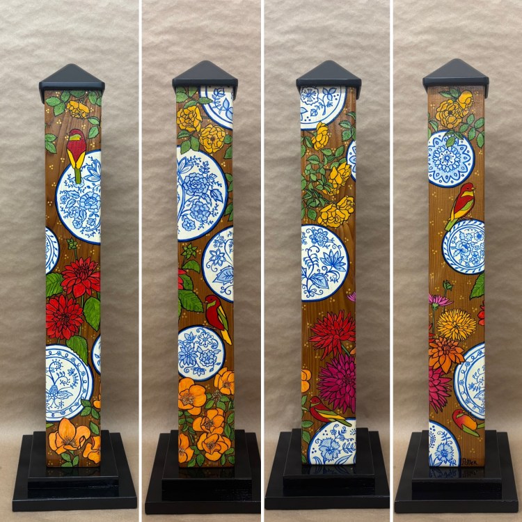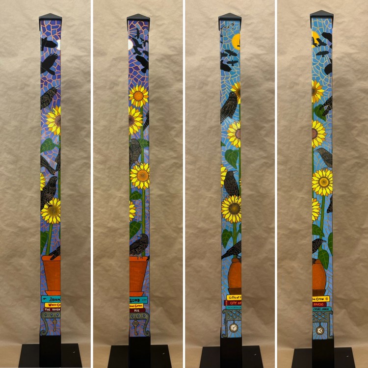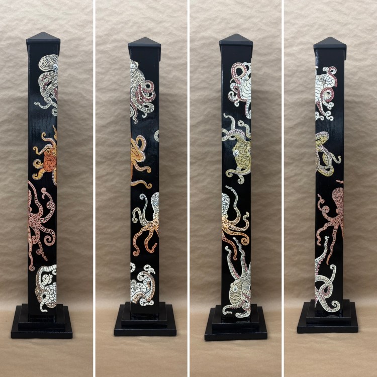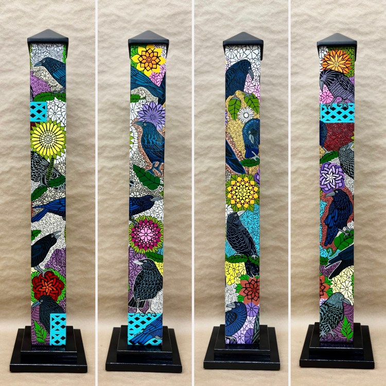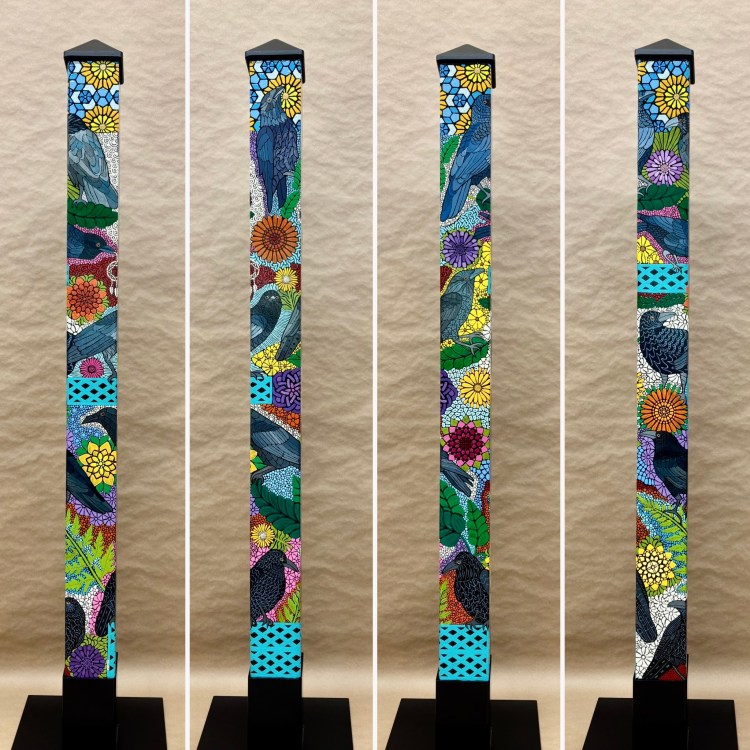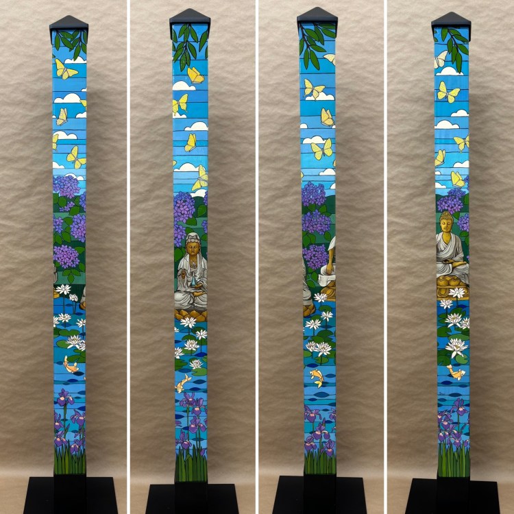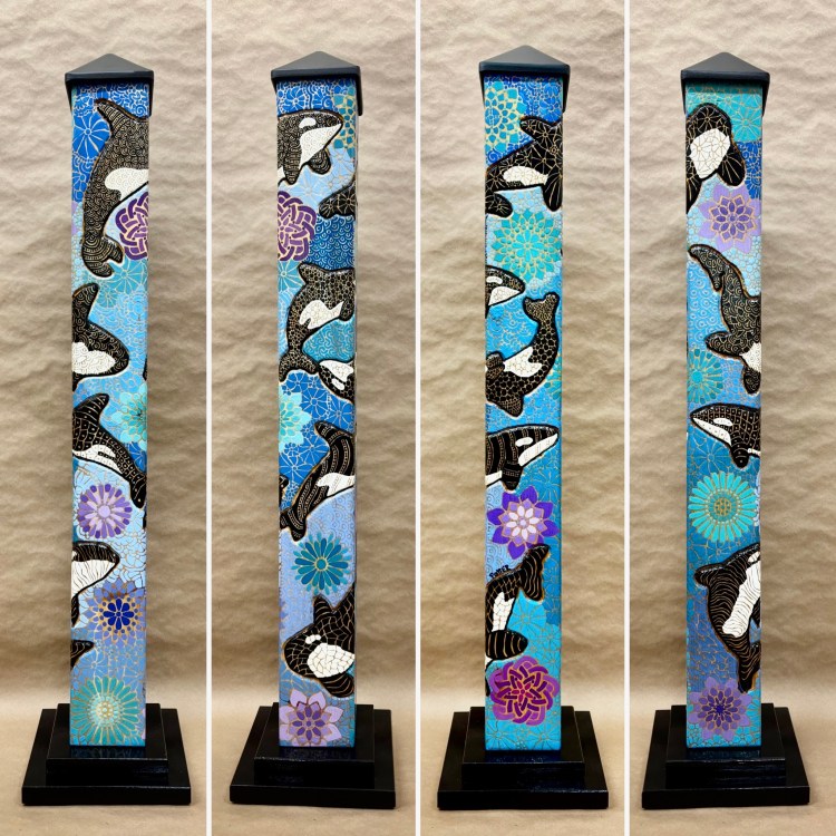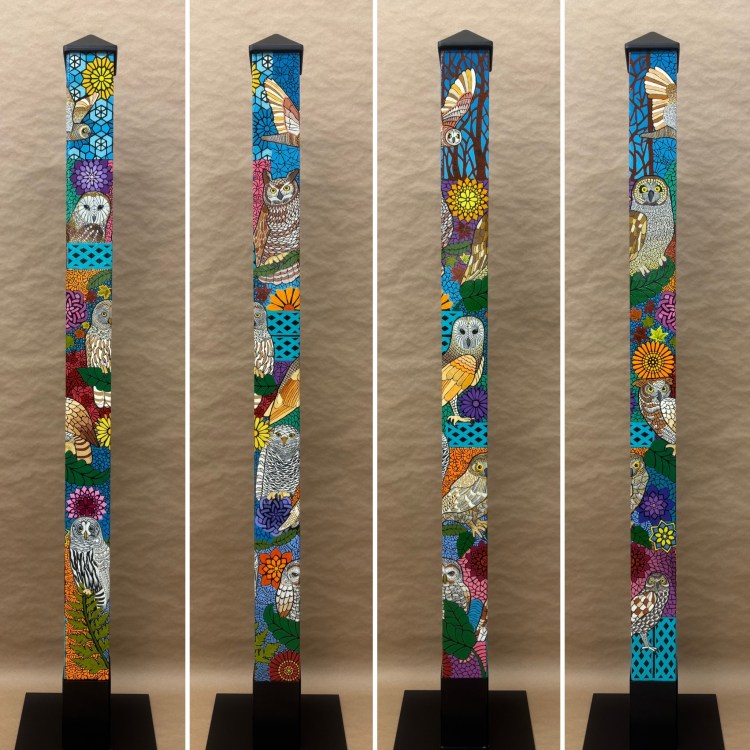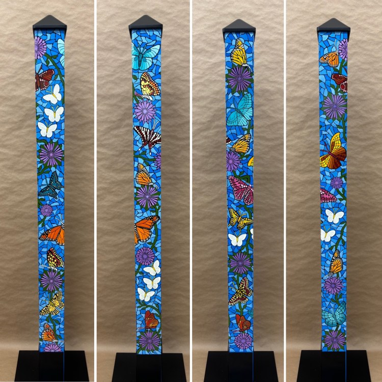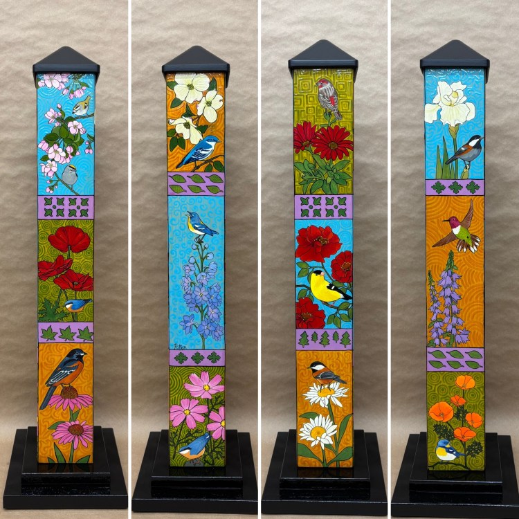 Section two of the gallery – POLES – displays our taller story poles (three feet or more…up to six feet). These poles all require a base to hold them safely and securely. Visit the “Information” page on this website to learn about the different base options for mounting your story pole indoors or outdoors. We are happy to talk with you about the best choice for your needs, so don’t hesitate to give us a call or send us a note to discuss the best base for you.