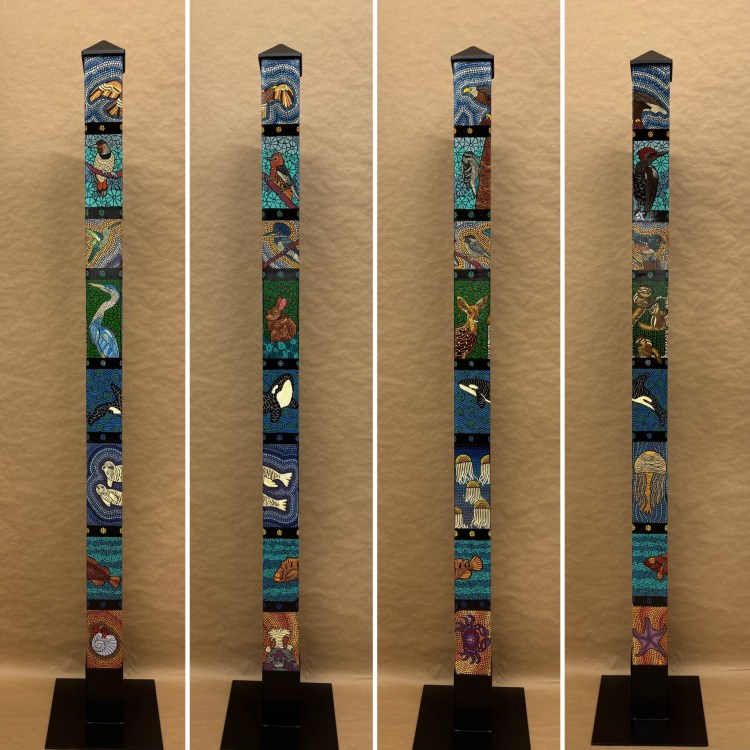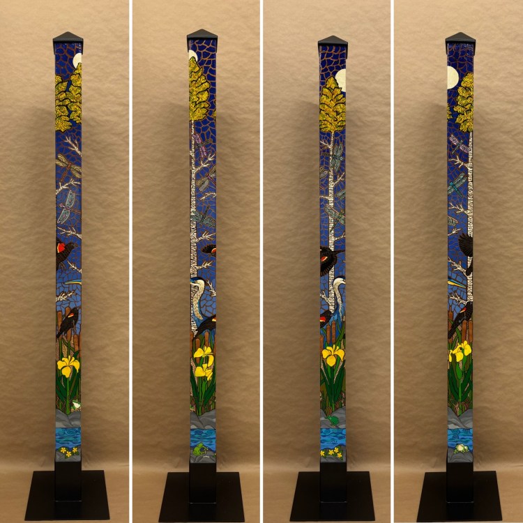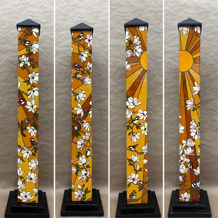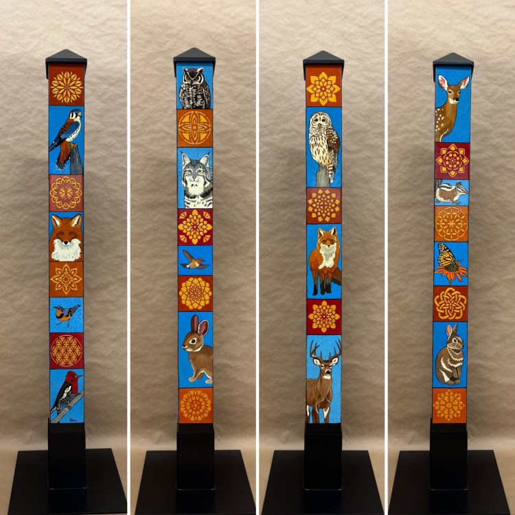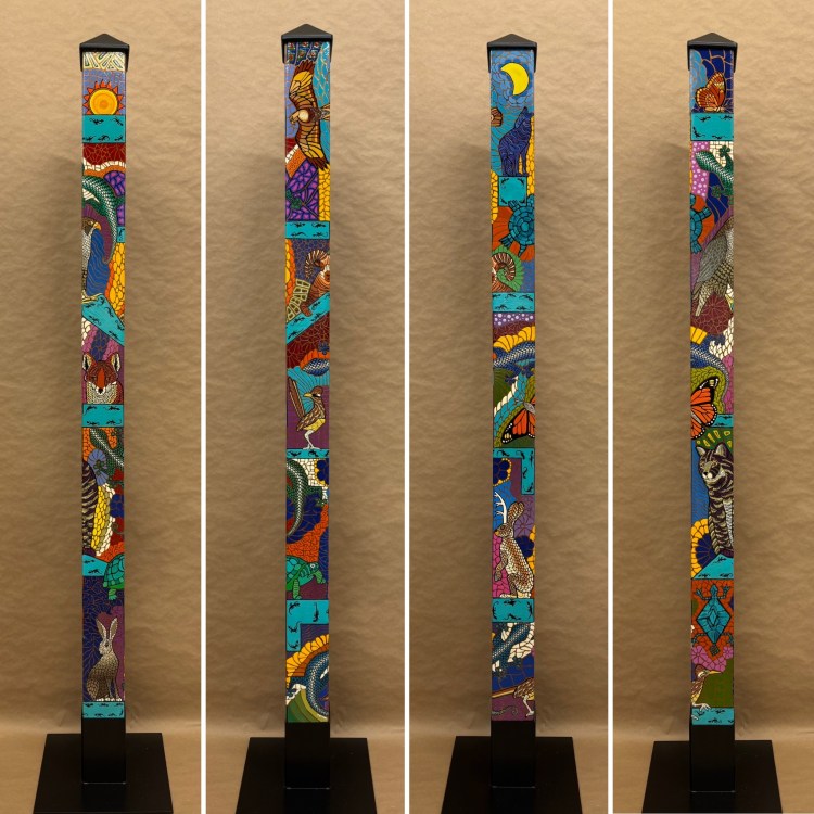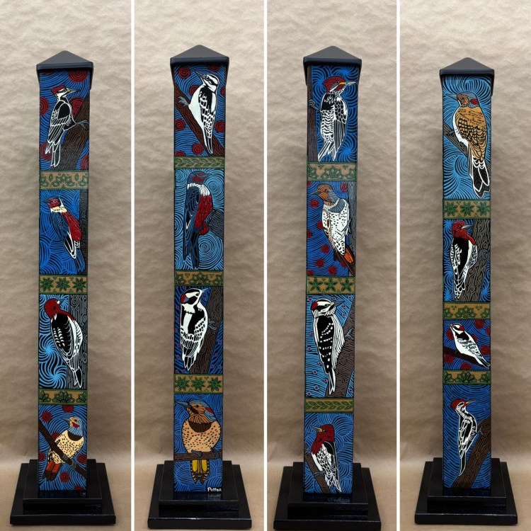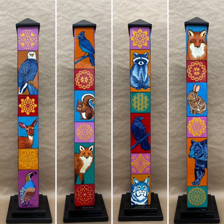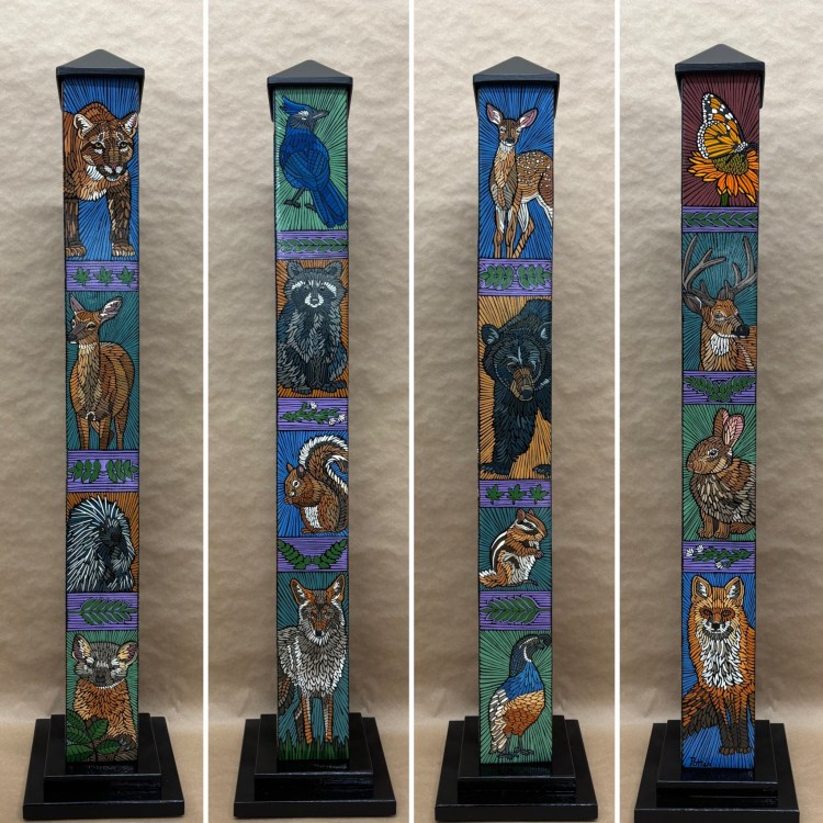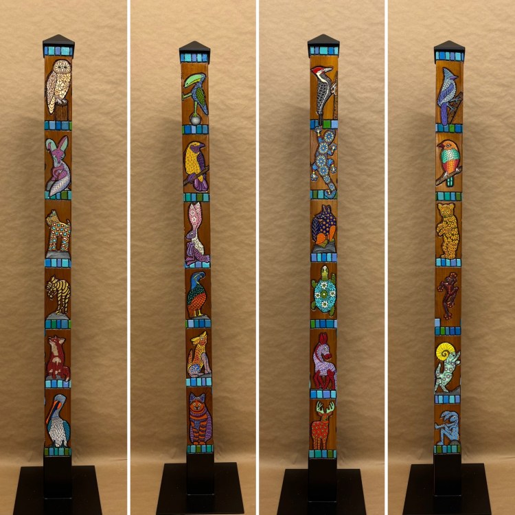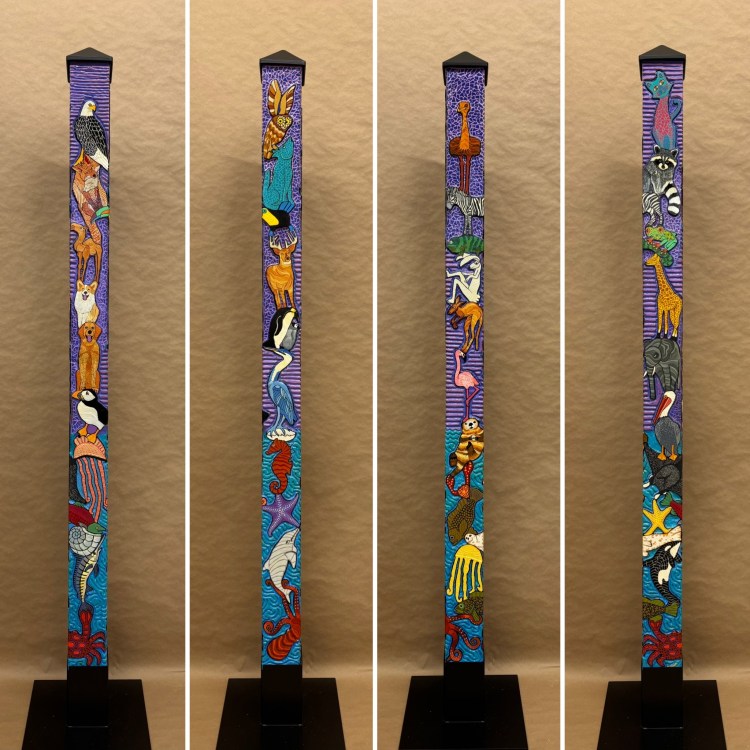 Section two of the gallery – POLES – displays our taller story poles (three feet or more…up to six feet). These poles all require a base to hold them safely and securely. Visit the “Information” page on this website to learn about the different base options for mounting your story pole indoors or outdoors. We are happy to talk with you about the best choice for your needs, so don’t hesitate to give us a call or send us a note to discuss the best base for you.