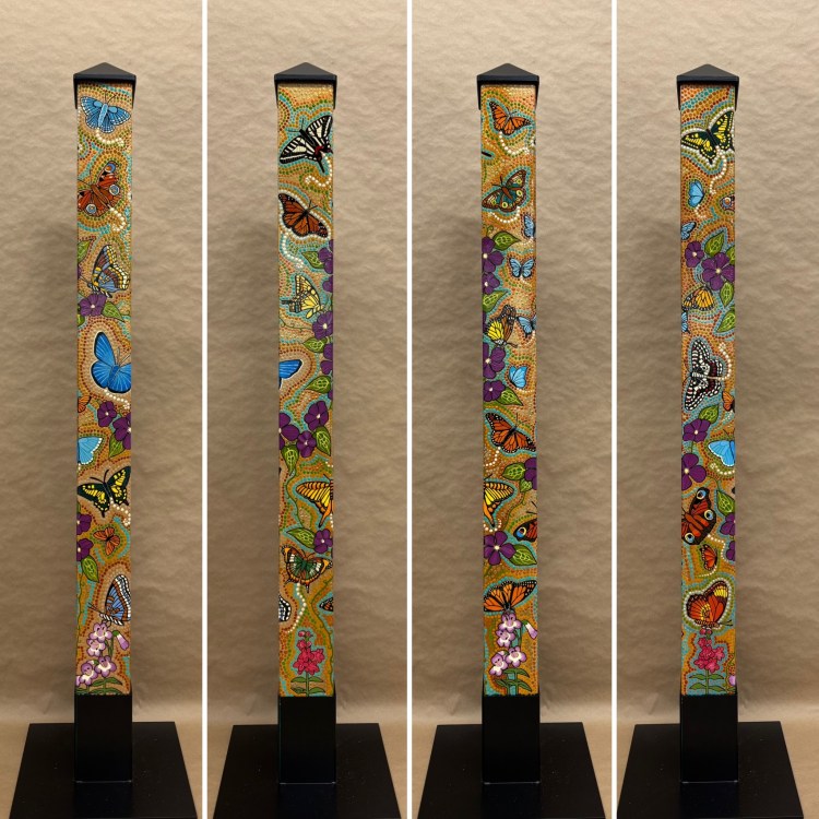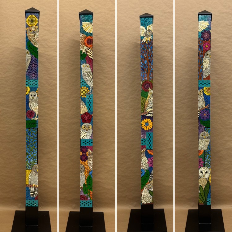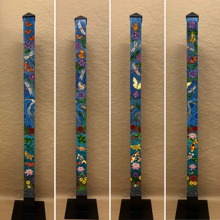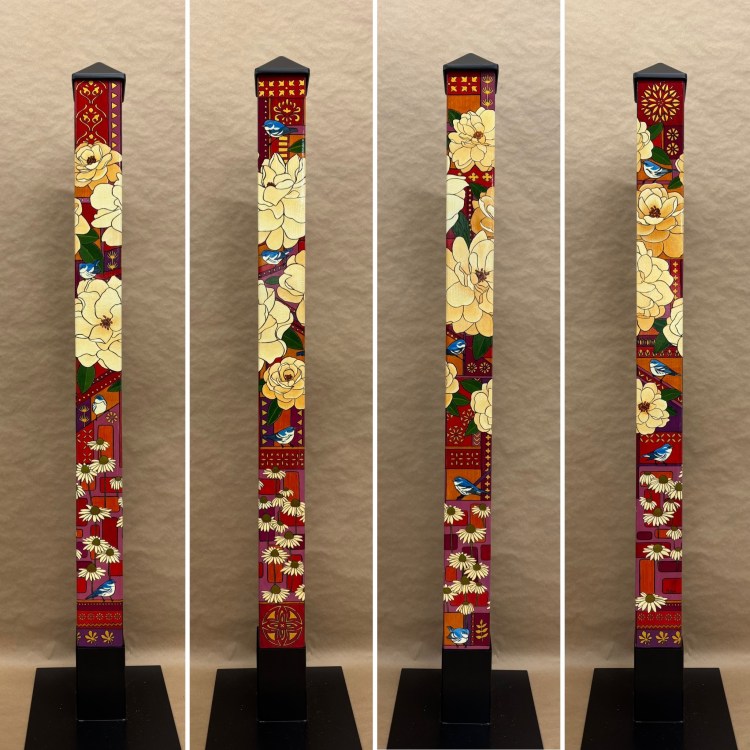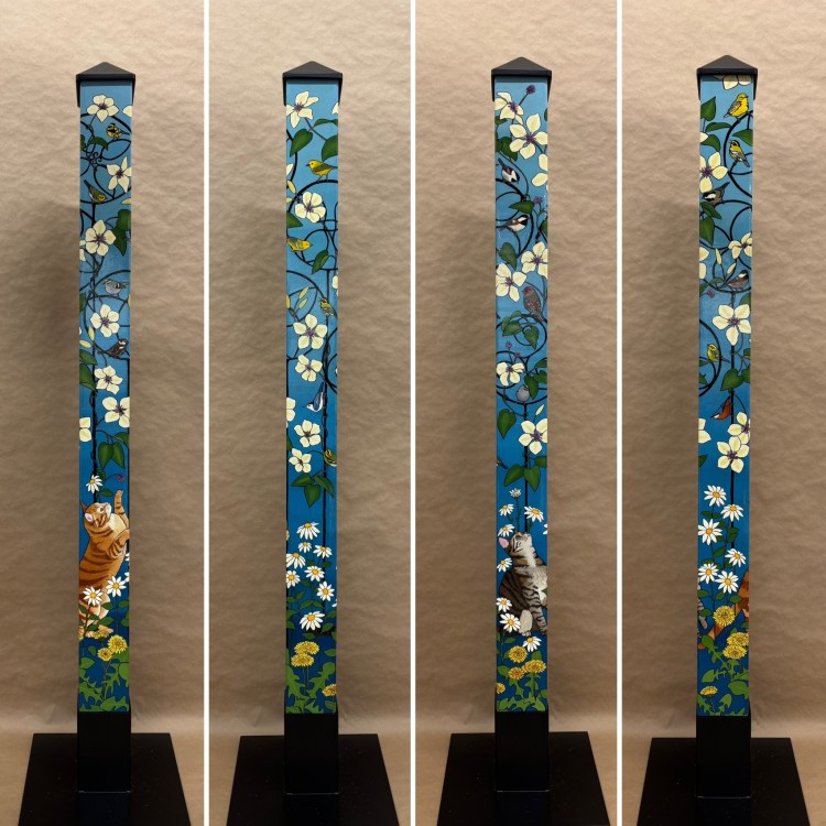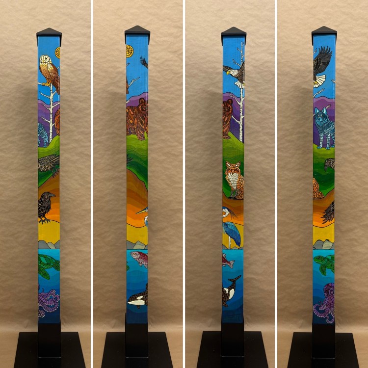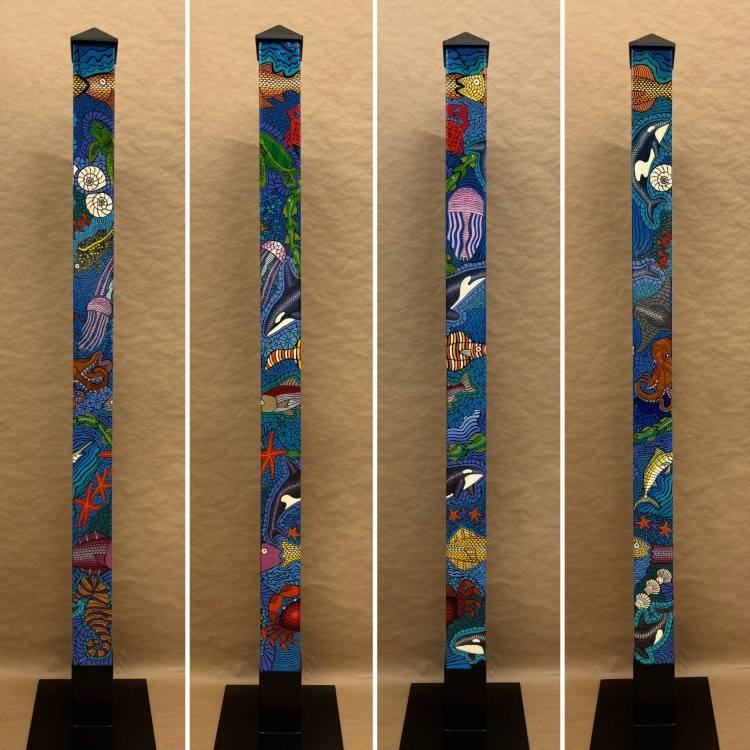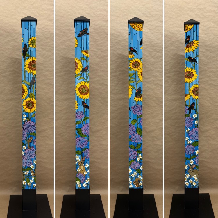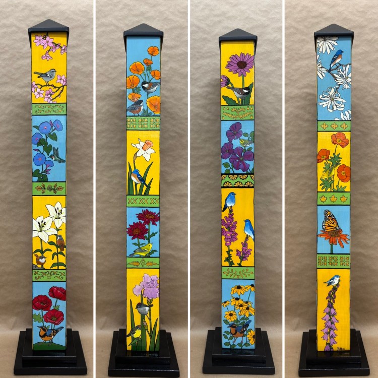Section two of the gallery – POLES – displays our taller story poles (three feet or more…up to six feet). These poles all require a base to hold them safely and securely. Visit the “Information” page on this website to learn about the different base options for mounting your story pole indoors or outdoors. We are happy to talk with you about the best choice for your needs, so don’t hesitate to give us a call or send us a note to discuss the best base for you.