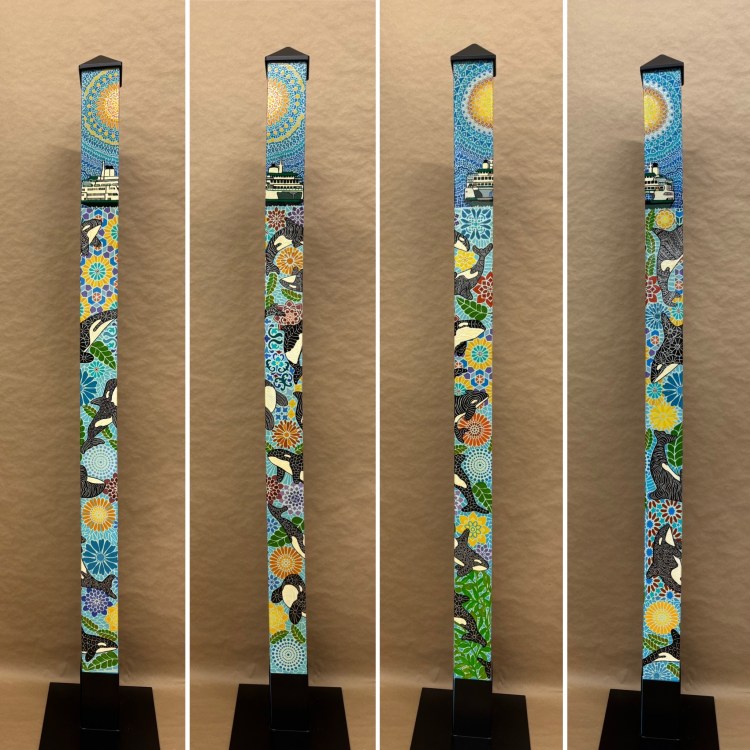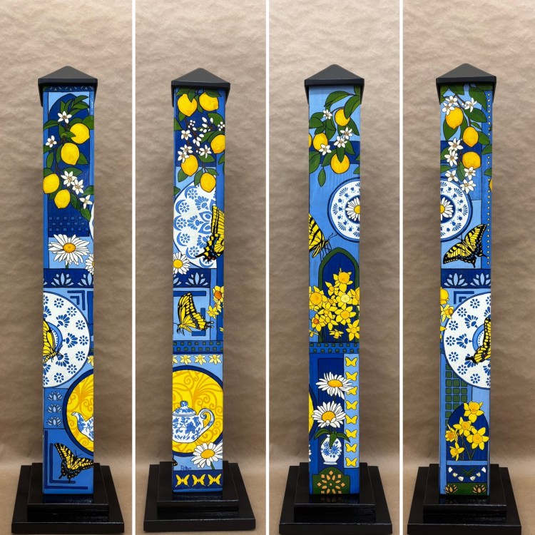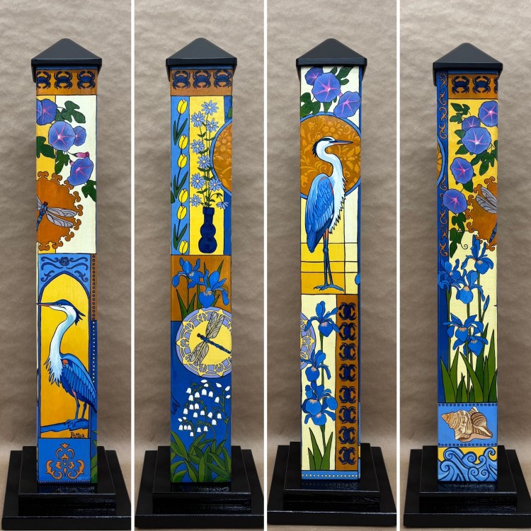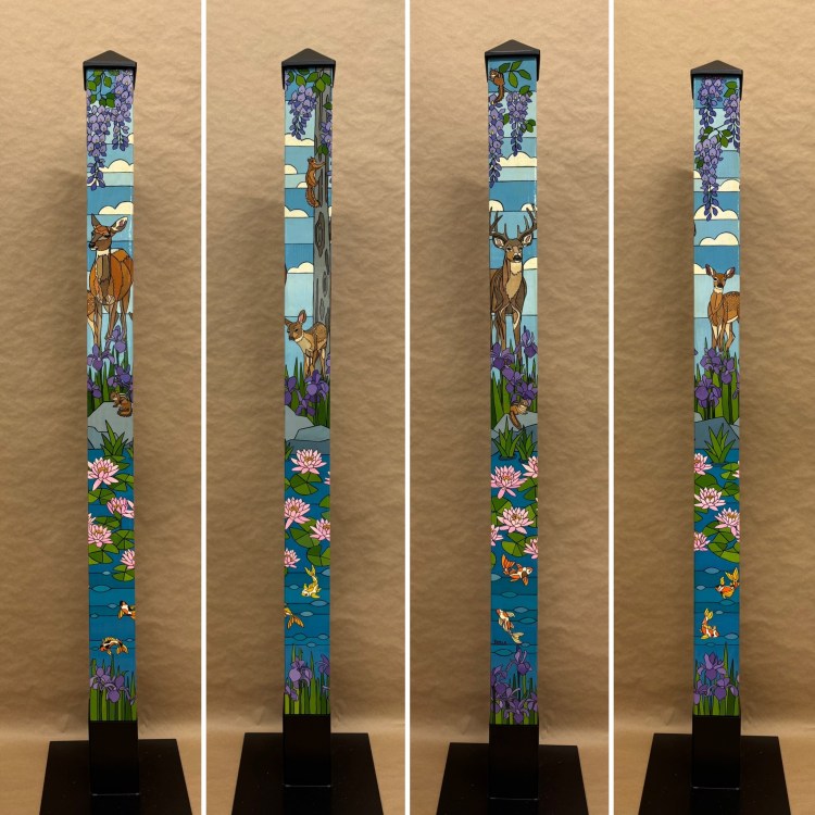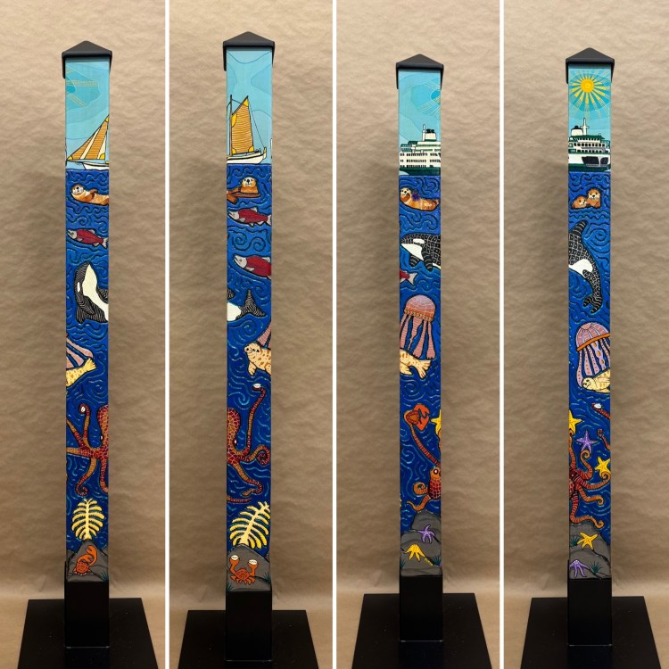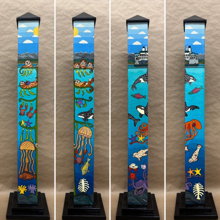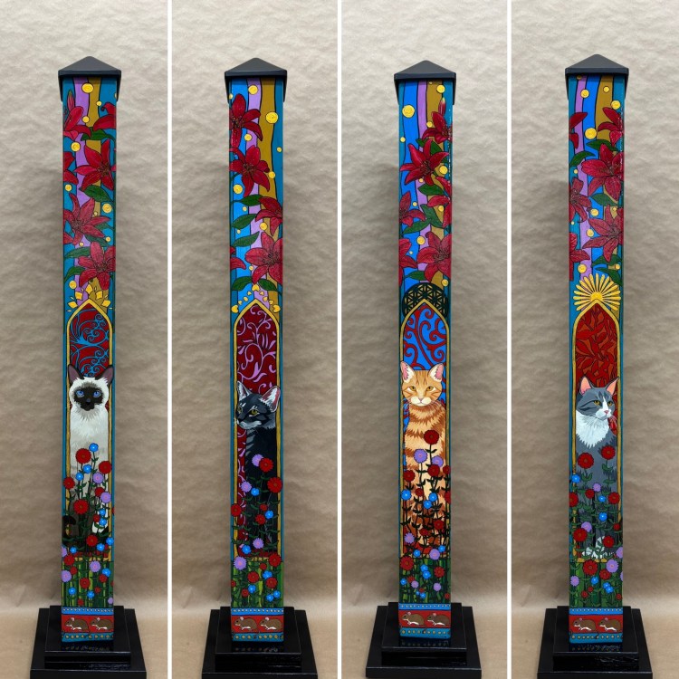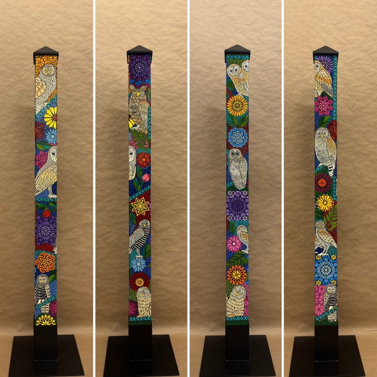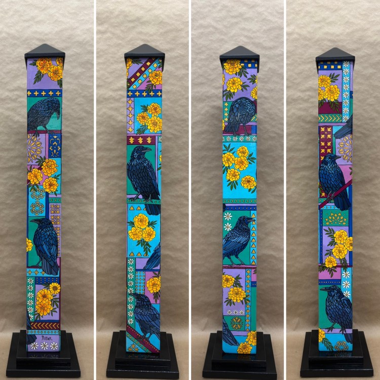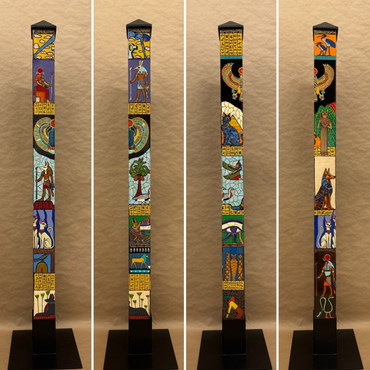 Section two of the gallery – POLES – displays our taller story poles (three feet or more…up to six feet). These poles all require a base to hold them safely and securely. Visit the “Information” page on this website to learn about the different base options for mounting your story pole indoors or outdoors. We are happy to talk with you about the best choice for your needs, so don’t hesitate to give us a call or send us a note to discuss the best base for you.